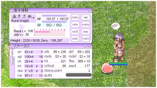 BaseLv95 / JobLv29 「紅雨」で「こうう」になります。
