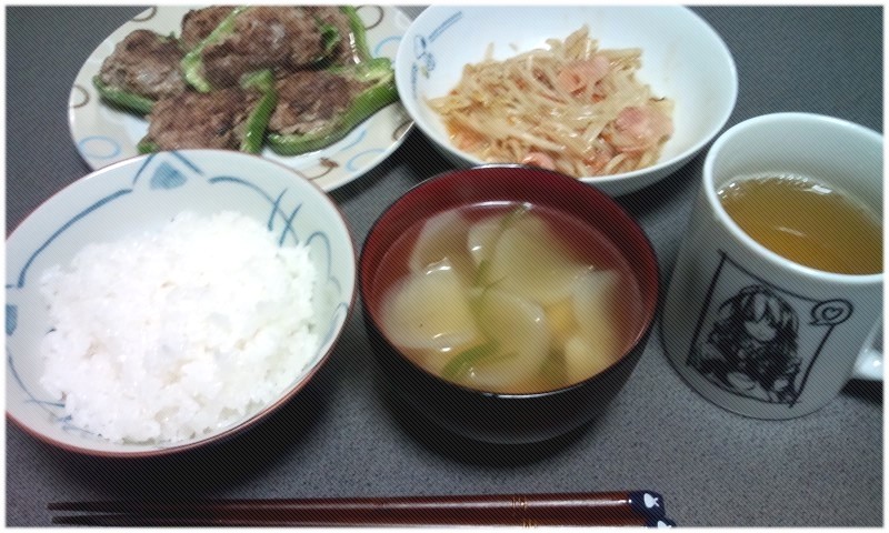 ちなみに右上はもやしとベーコンの炒め物(味付けは市販のレトルト?のもの)。